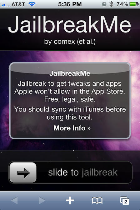 But it comes at a price. The jailbreak exploits a wide-open security hole that could easily be exploited by malicious hackers. Malicious sites that install malware could exploit the largely unkown, unpatched security hole.