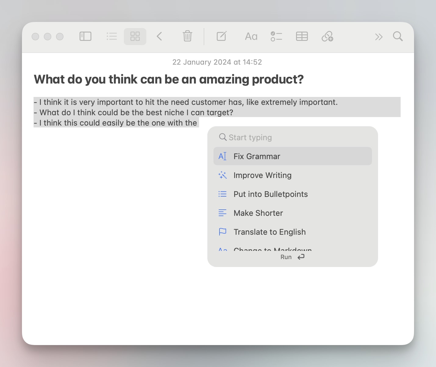 To use Fixkey, simply press ⌥ + S to select and fix the current line you’re working on. Alternatively, you can select a chunk of text and then press ⌥ + J to trigger the app’s Popup-Fixer. This powerful popup will let you create bullet points, summarize the highlighted text or even translate the words into another language, among many other options.