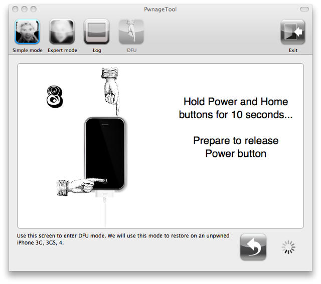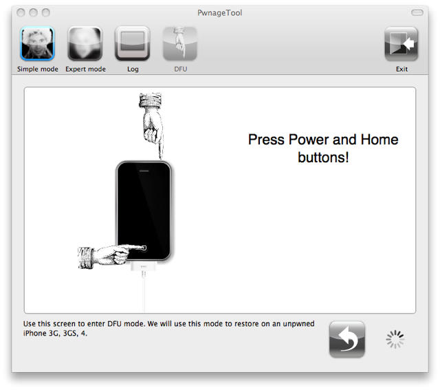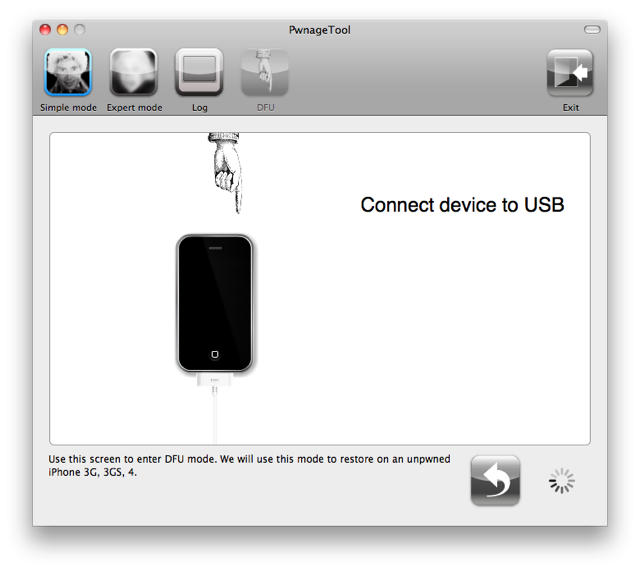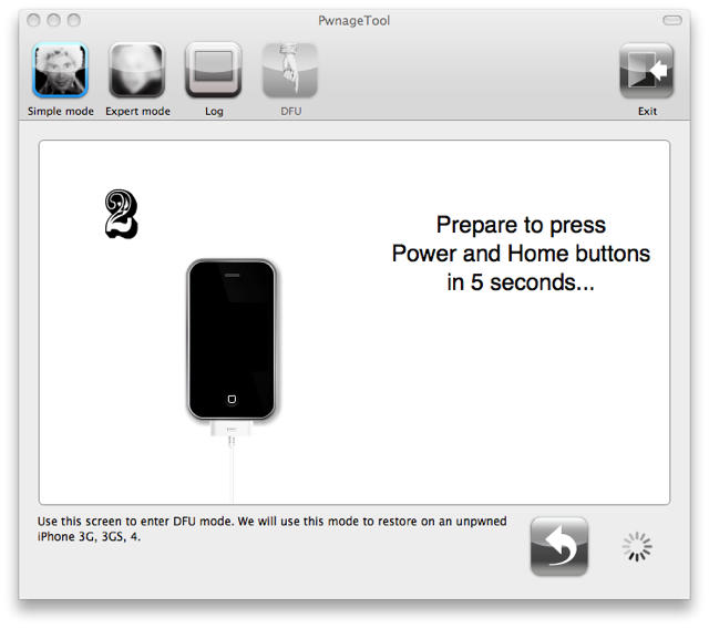 6. Connect your device to the Mac and follow PwnageTool on-screen instructions to enter DFU mode.
