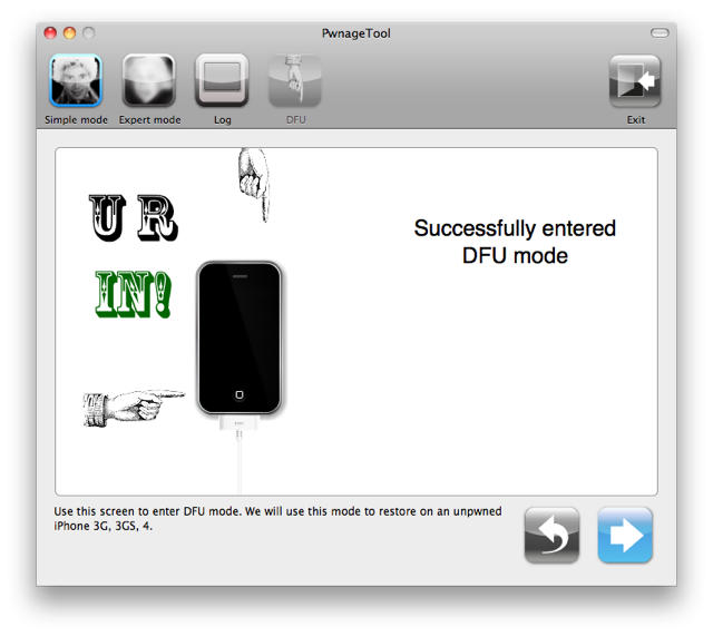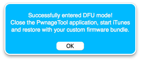 7. PwnageTool will now tell you that you have successfully entered DFU mode, click ‘OK’ and close the application.
