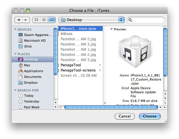 9. Select your device from the list of devices. Press and hold the ‘option’ key on the keyboard and click the restore button. Select the newly created custom firmware located on your desktop and click ‘Choose’. iTunes will then being restoring your iPhone to the custom firmware.