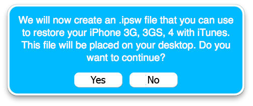 4. When prompted to create and save a custom firmware file to your Desktop, choose ‘Yes’. Next, it will ask, if you have an AT&T contract (for iPhone), choose ‘Yes’ if you want to activate normally using iTunes, otherwise, choose ‘No’ (this will allow you to use the iPhone with any AT&T data plan).