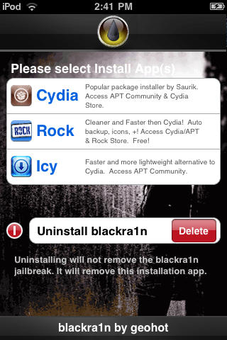 9. If you want to remove the blackra1n application from the device, open the application again and tap ‘Uninstall blackra1n’, this will NOT undo the jailbreak by any means. The device will now re-spring and you will no longer have the application.
