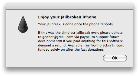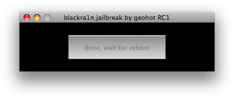 4. A few seconds later, you will get an image of GeoHot on your device’s screen. The Blackra1n program on your Mac / PC will request you to donate to GeoHot, click ‘OK’. Now it will tell you to wait, till the device reboots. You can now close the program.