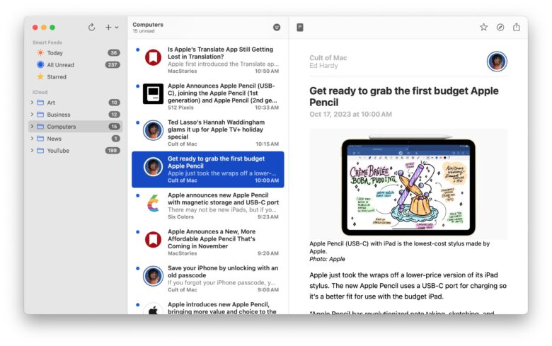 NetNewsWire is a delightfully simple RSS reader for Mac, iPhone and iPad that syncs over iCloud. What’s an RSS reader? It’s the best way to keep up with your news, read blog posts, get YouTube videos, read webcomics and follow anything online.