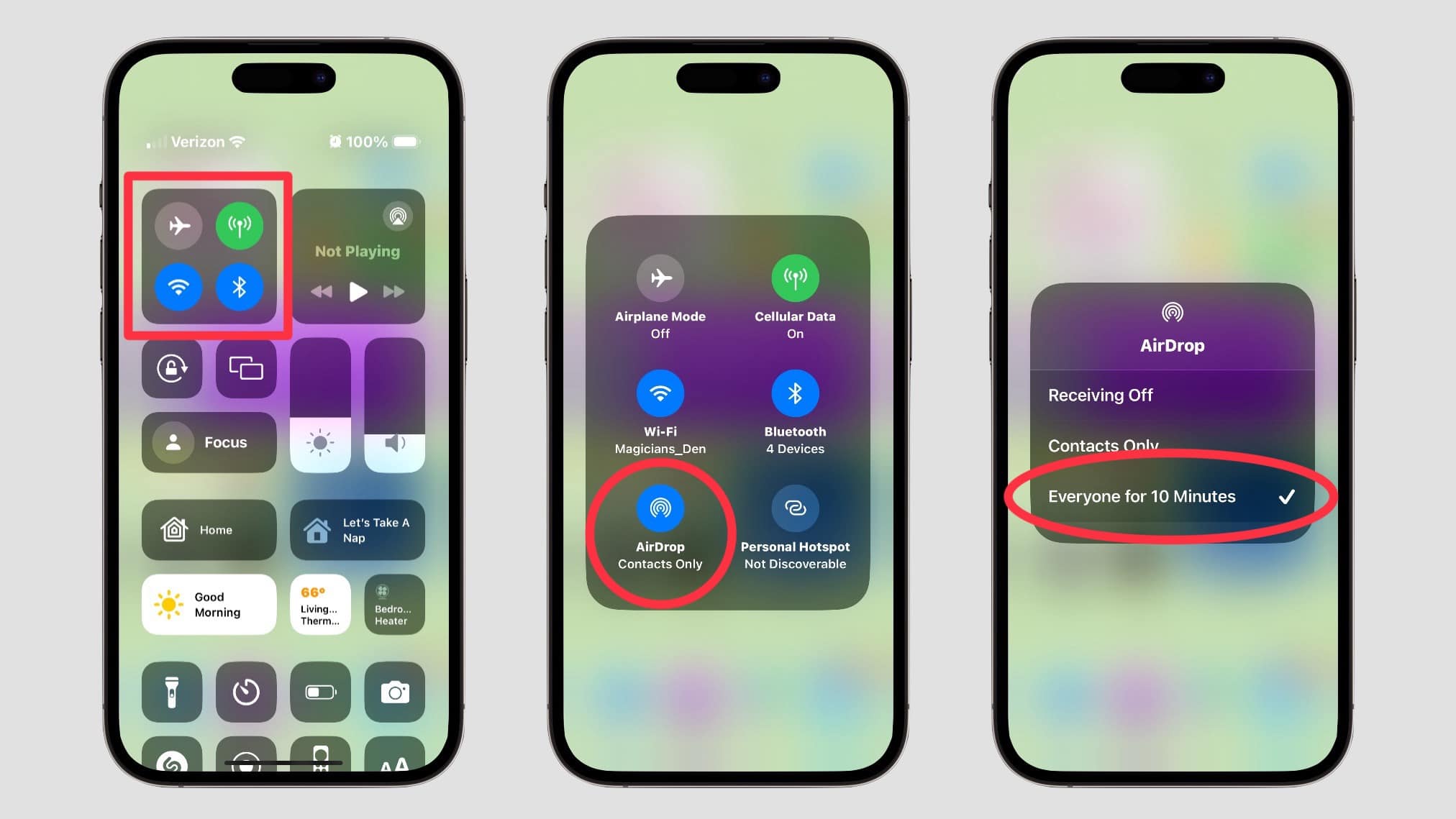 One option to accomplish this is to open the Control Center on your iPhone (swipe down from the top-right corner of your screen), then tap and hold in the center of the dark gray box with the Wi-Fi and Bluetooth icons. A larger box opens with an icon labeled AirDrop. Tap on it. This opens a pop-up window with three options. Choose Everyone for 10 Minutes.