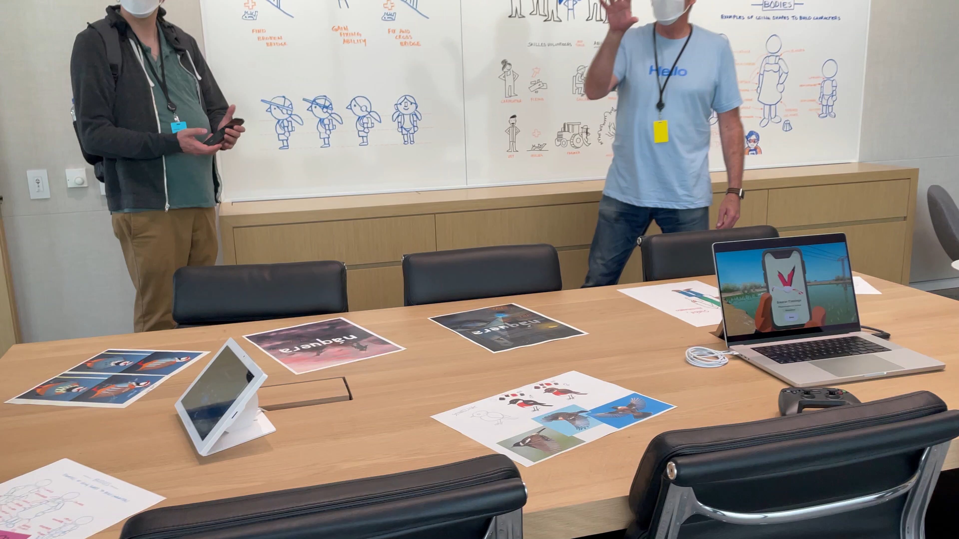 The table in the AR testing room has design concept sketches alongside screenshots of the final product.