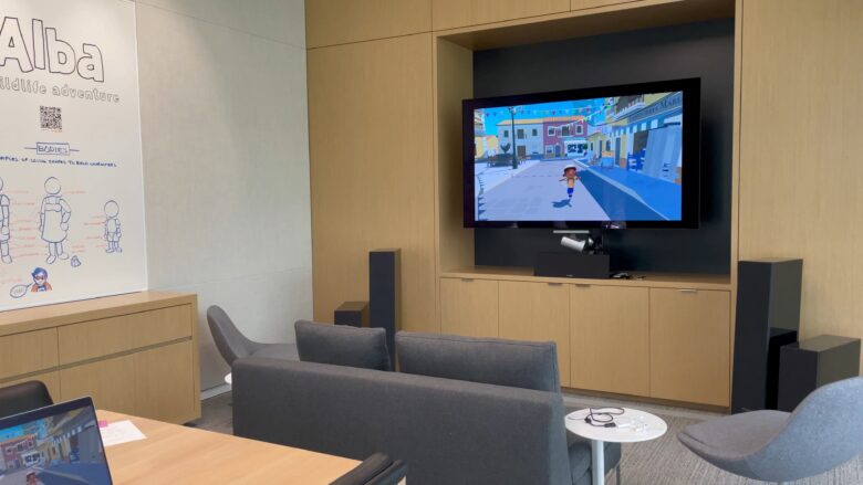 The presentation room has artwork from Alba, an Apple Design Award winner. The room has frosted glass walls (behind me, not pictured) to let in natural light while maintaining privacy. I asked what the contents of the cabinets are, and the tour guide opened them to reveal they are empty. Photo: D. Griffin Jones/Cult of MacThe presentation room has sofas and a TV in addition to the conference table. Photo: D. Griffin Jones/Cult of Mac