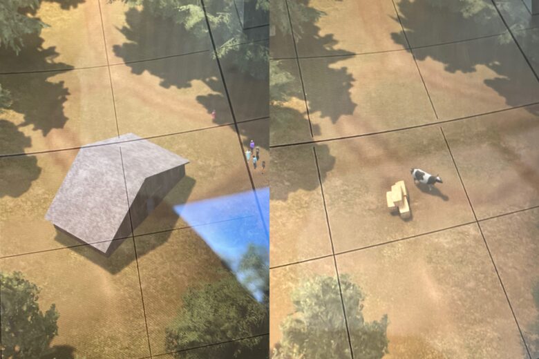 Visitors are handed an iPad running a custom app. When you scan the model, the app uses ARKit to superimpose a big, animated 3D simulation of the campus.
